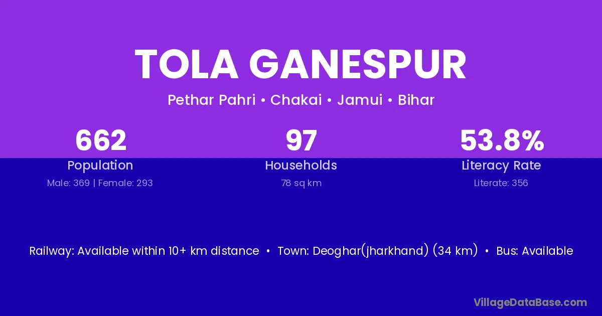 Deoghar(jharkhand) (34 km) is the nearest town to Tola Ganespur village for major economic activities and is located approximately 34 km away.