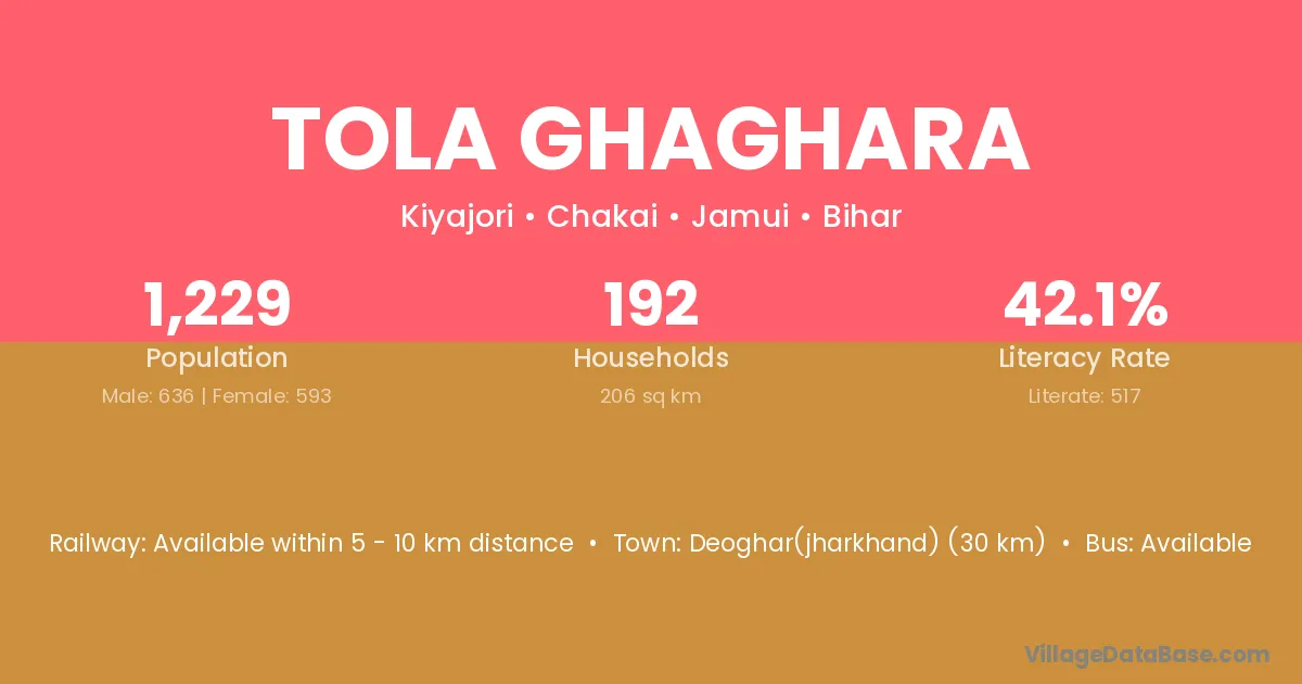Deoghar(jharkhand) (30 km) is the nearest town to Tola Ghaghara village for major economic activities and is located approximately 30 km away.