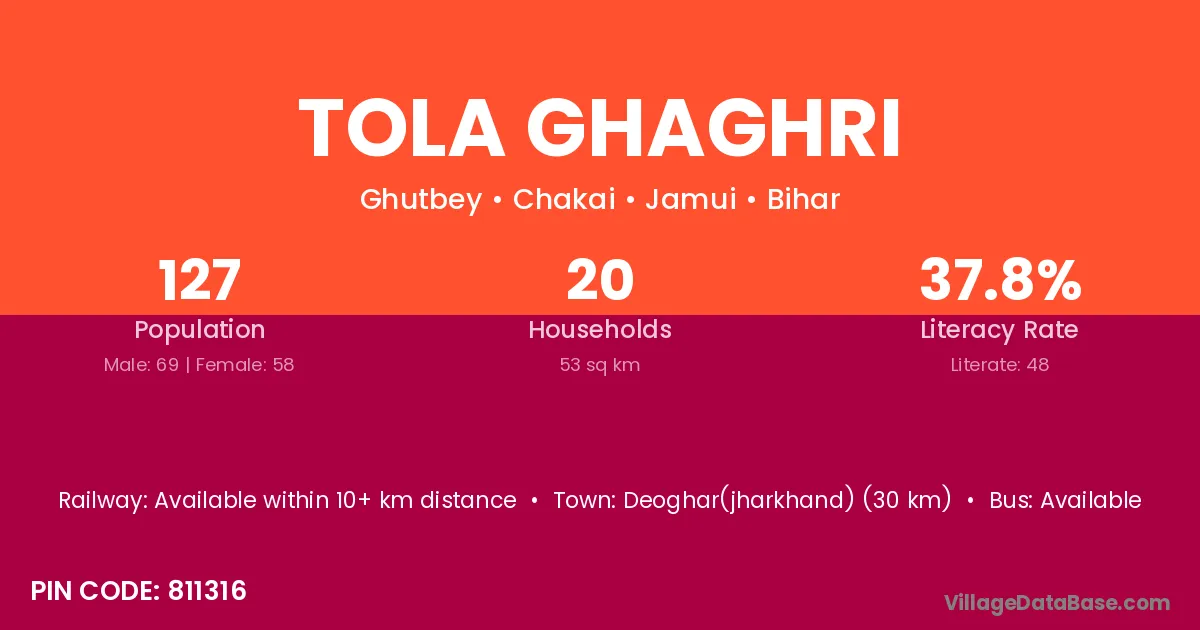 Deoghar(jharkhand) (30 km) is the nearest town to Tola Ghaghri village for major economic activities and is located approximately 30 km away.