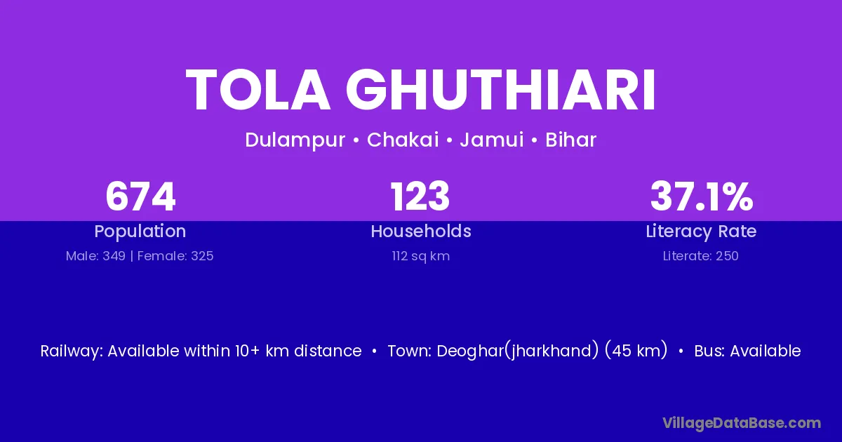 Deoghar(jharkhand) (45 km) is the nearest town to Tola Ghuthiari village for major economic activities and is located approximately 45 km away.