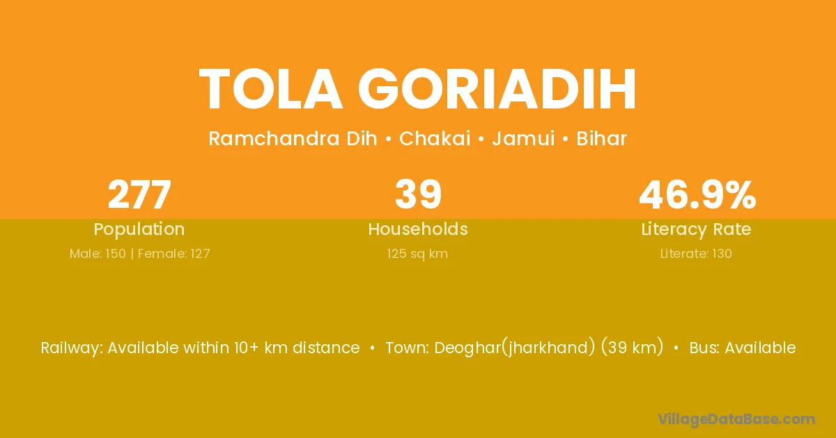 Deoghar(jharkhand) (39 km) is the nearest town to Tola Goriadih village for major economic activities and is located approximately 39 km away.
