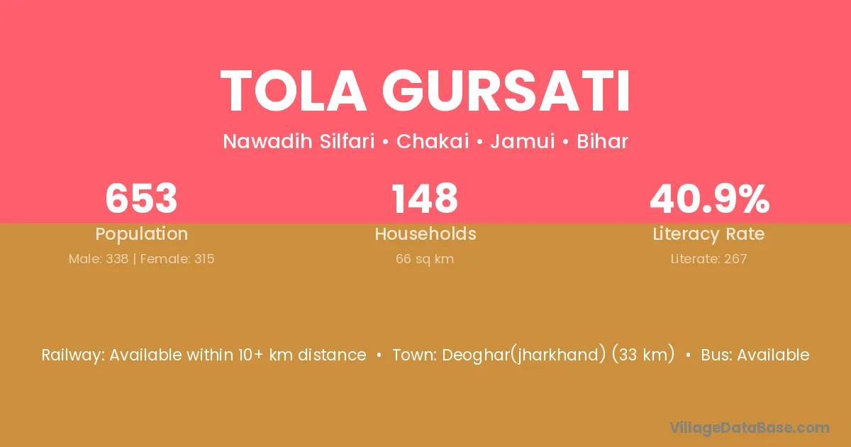 Deoghar(jharkhand) (33 km) is the nearest town to Tola Gursati village for major economic activities and is located approximately 33 km away.