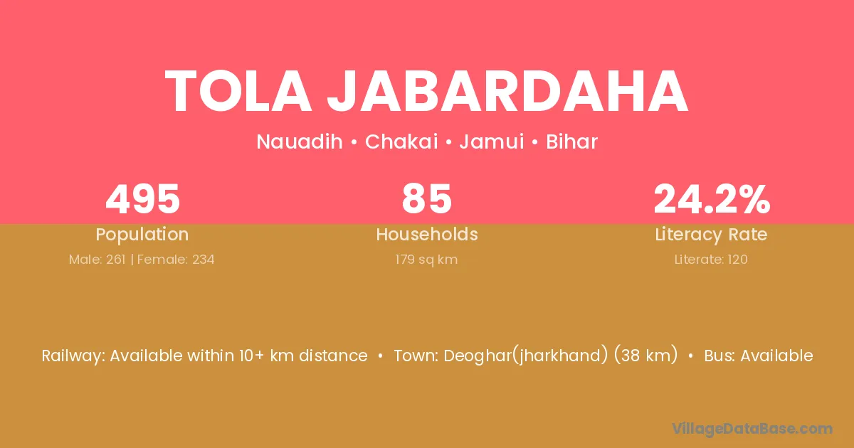 Deoghar(jharkhand) (38 km) is the nearest town to Tola Jabardaha village for major economic activities and is located approximately 38 km away.
