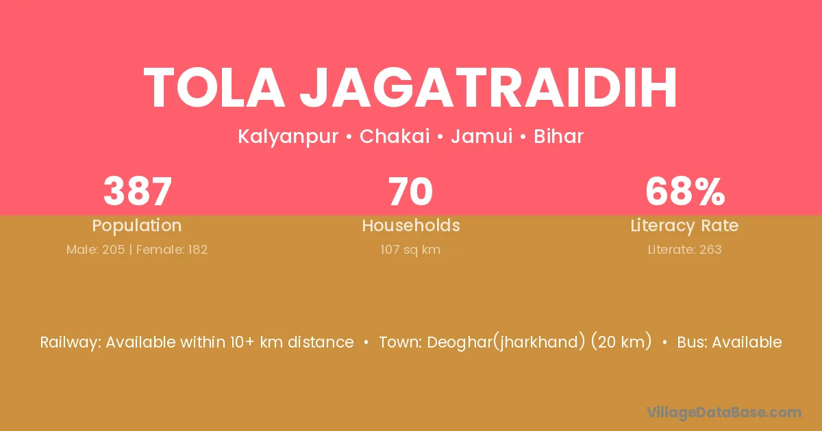 Tola Jagatraidih village has a total population of 387 people, of which 205 are males and 182 are females.