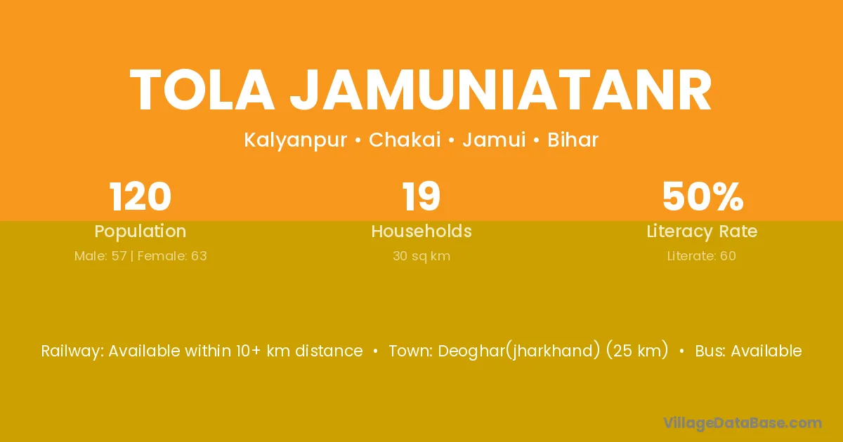 Deoghar(jharkhand) (25 km) is the nearest town to Tola Jamuniatanr village for major economic activities and is located approximately 25 km away.