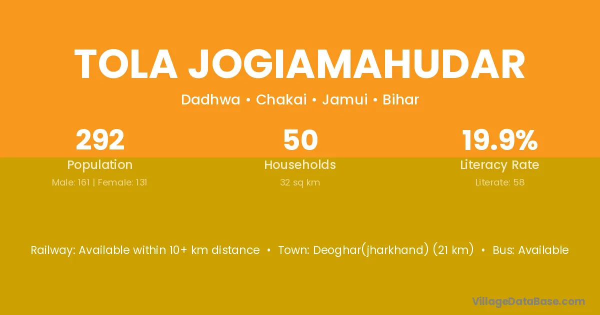Tola Jogiamahudar village has a total population of 292 people, of which 161 are males and 131 are females.