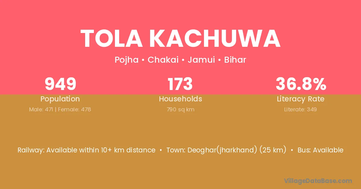 Deoghar(jharkhand) (25 km) is the nearest town to Tola Kachuwa village for major economic activities and is located approximately 25 km away.