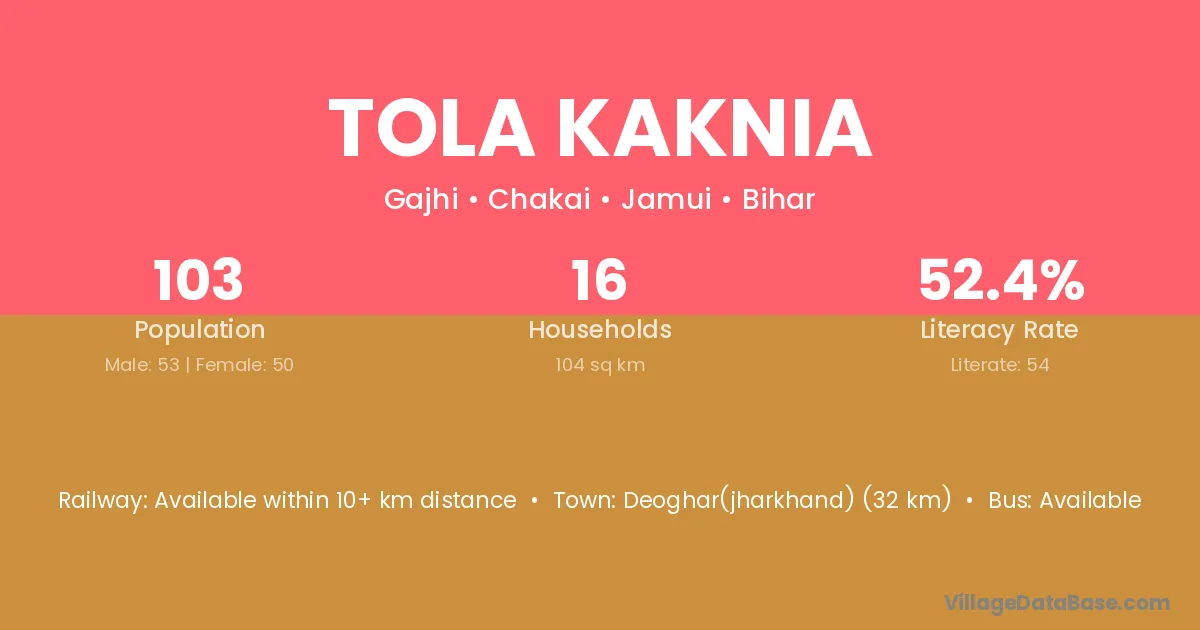 Deoghar(jharkhand) (32 km) is the nearest town to Tola Kaknia village for major economic activities and is located approximately 32 km away.