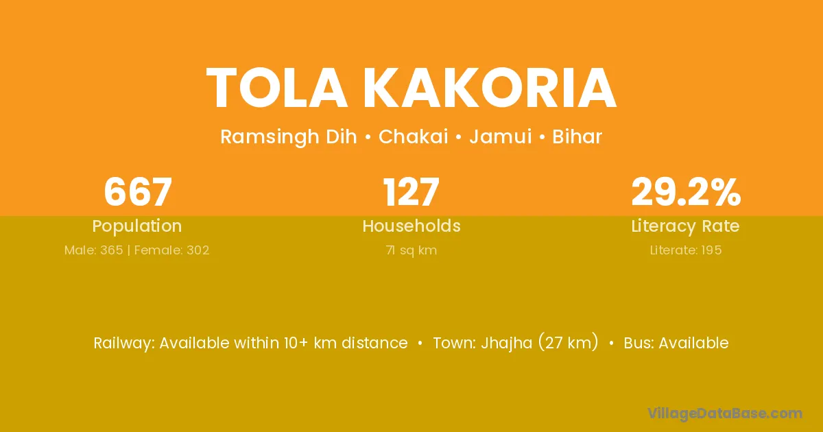 Jhajha (27 km) is the nearest town to Tola Kakoria village for major economic activities and is located approximately 27 km away.