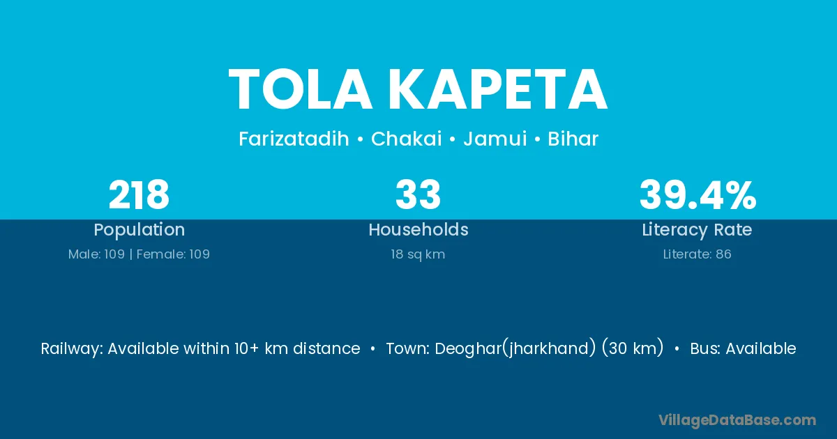 Deoghar(jharkhand) (30 km) is the nearest town to Tola Kapeta village for major economic activities and is located approximately 30 km away.