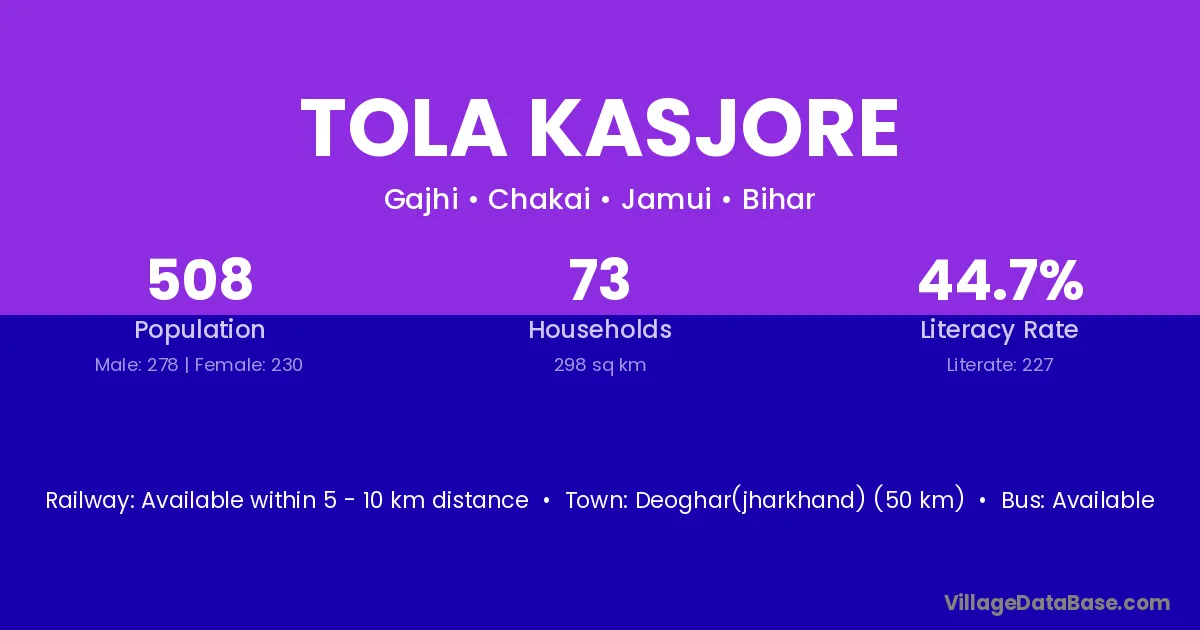 Deoghar(jharkhand) (50 km) is the nearest town to Tola Kasjore village for major economic activities and is located approximately 50 km away.