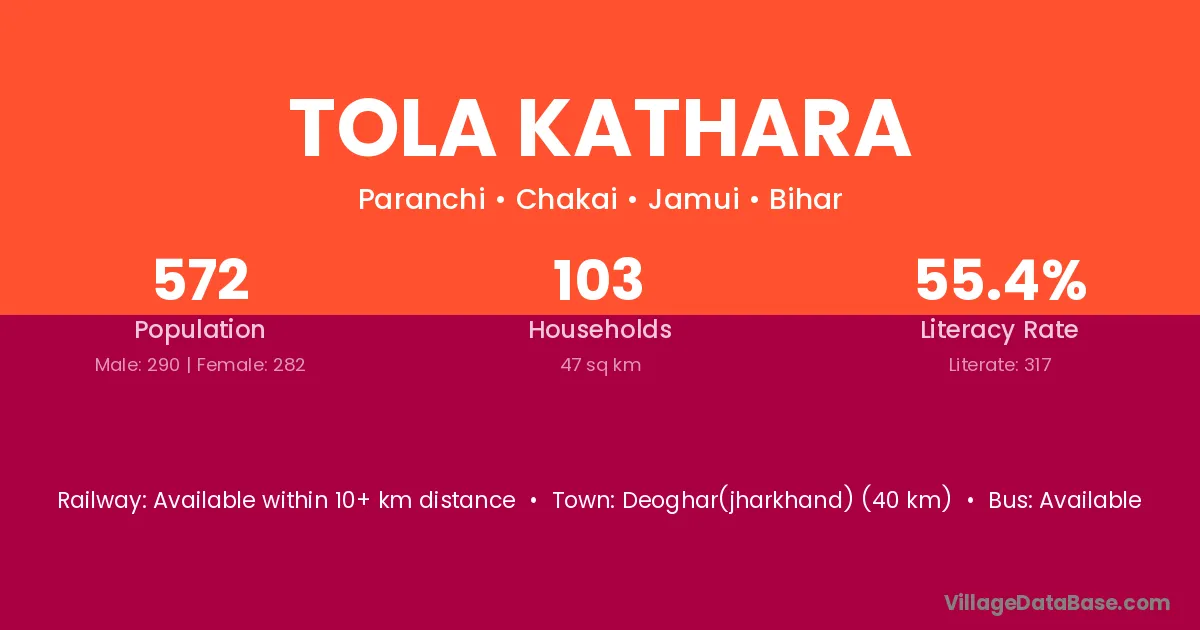 Deoghar(jharkhand) (40 km) is the nearest town to Tola Kathara village for major economic activities and is located approximately 40 km away.