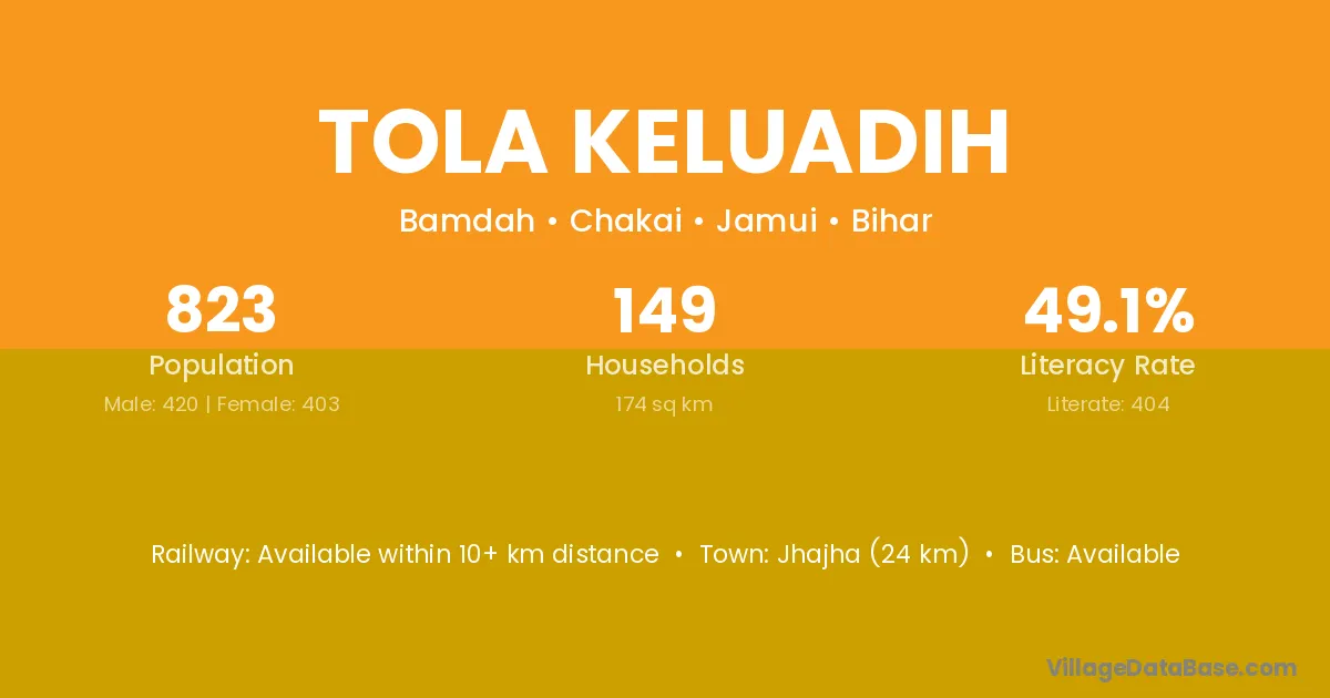 Jhajha (24 km) is the nearest town to Tola Keluadih village for major economic activities and is located approximately 24 km away.
