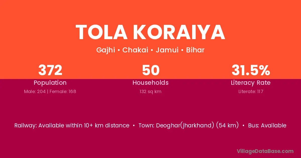 Deoghar(jharkhand) (54 km) is the nearest town to Tola Koraiya village for major economic activities and is located approximately 54 km away.