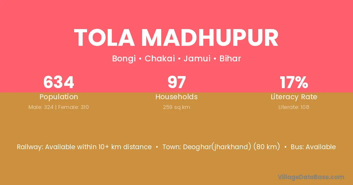 Deoghar(jharkhand) (80 km) is the nearest town to Tola Madhupur village for major economic activities and is located approximately 80 km away.
