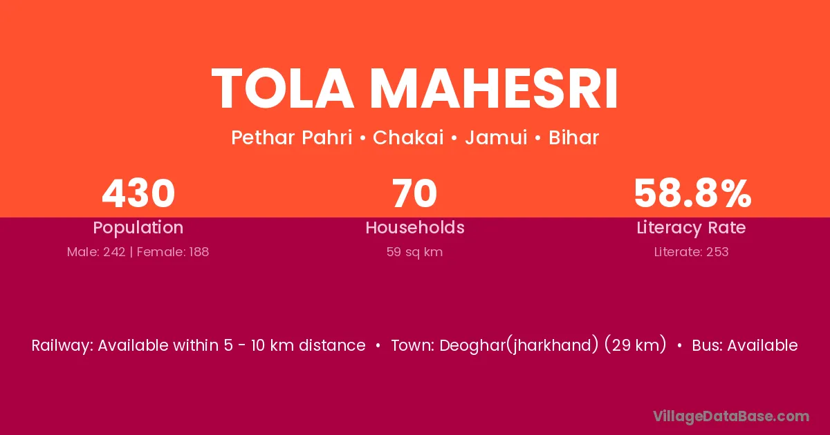 Tola Mahesri village has a total population of 430 people, of which 242 are males and 188 are females.