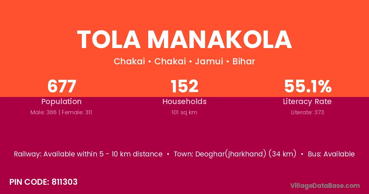 Deoghar(jharkhand) (34 km) is the nearest town to Tola Manakola village for major economic activities and is located approximately 34 km away.