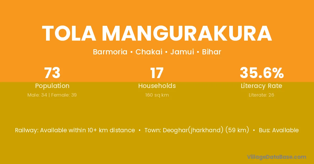 Deoghar(jharkhand) (59 km) is the nearest town to Tola Mangurakura village for major economic activities and is located approximately 59 km away.