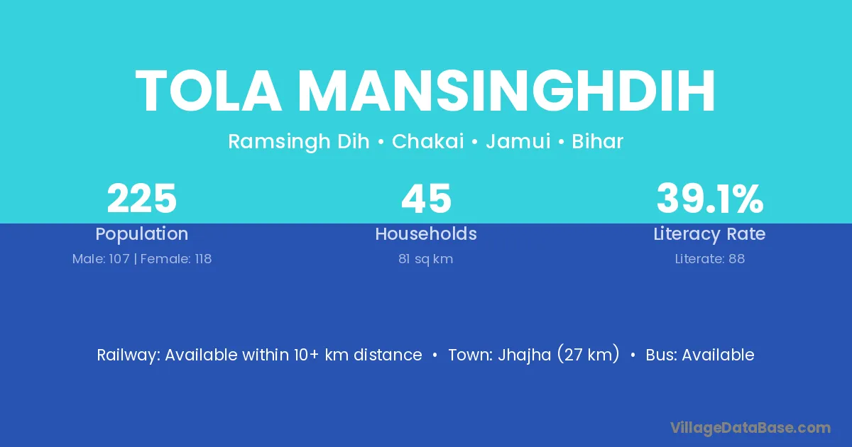 Jhajha (27 km) is the nearest town to Tola Mansinghdih village for major economic activities and is located approximately 27 km away.
