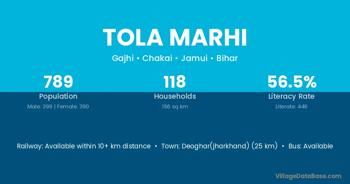 Deoghar(jharkhand) (25 km) is the nearest town to Tola Marhi village for major economic activities and is located approximately 25 km away.