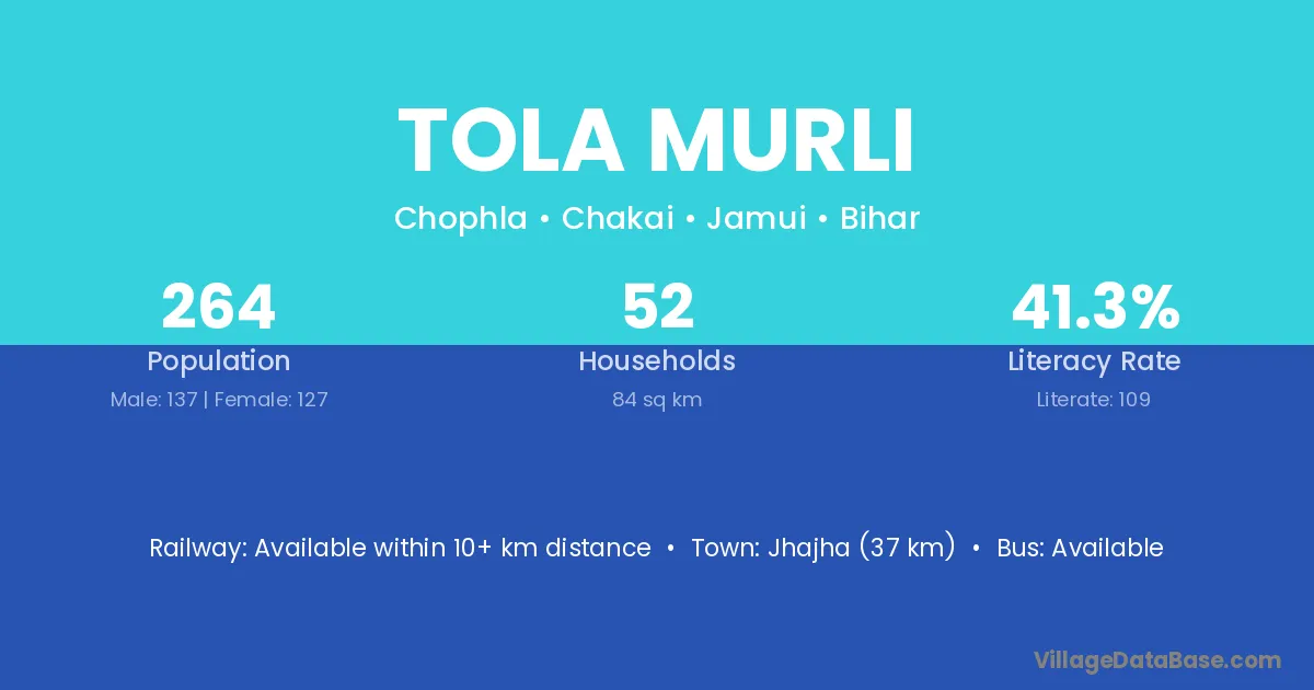 Jhajha (37 km) is the nearest town to Tola Murli village for major economic activities and is located approximately 37 km away.
