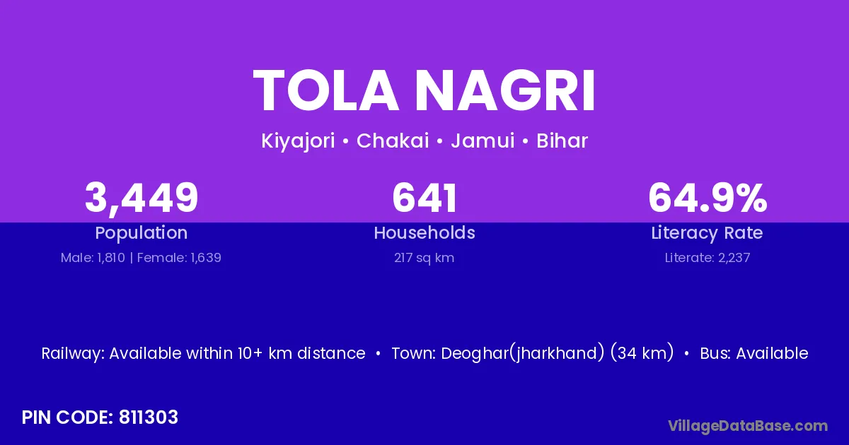 Deoghar(jharkhand) (34 km) is the nearest town to Tola Nagri village for major economic activities and is located approximately 34 km away.
