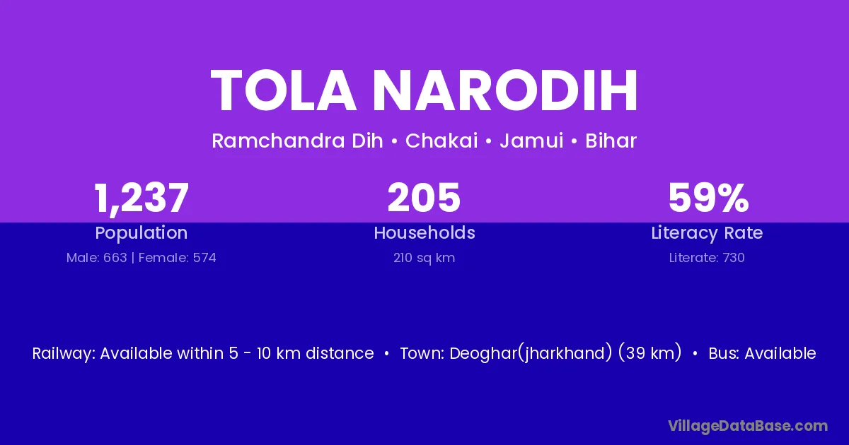 Deoghar(jharkhand) (39 km) is the nearest town to Tola Narodih village for major economic activities and is located approximately 39 km away.