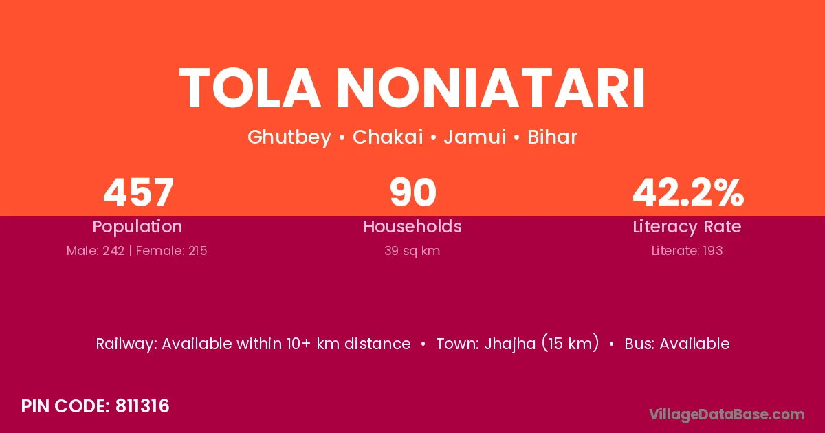 Jhajha (15 km) is the nearest town to Tola Noniatari village for major economic activities and is located approximately 15 km away.