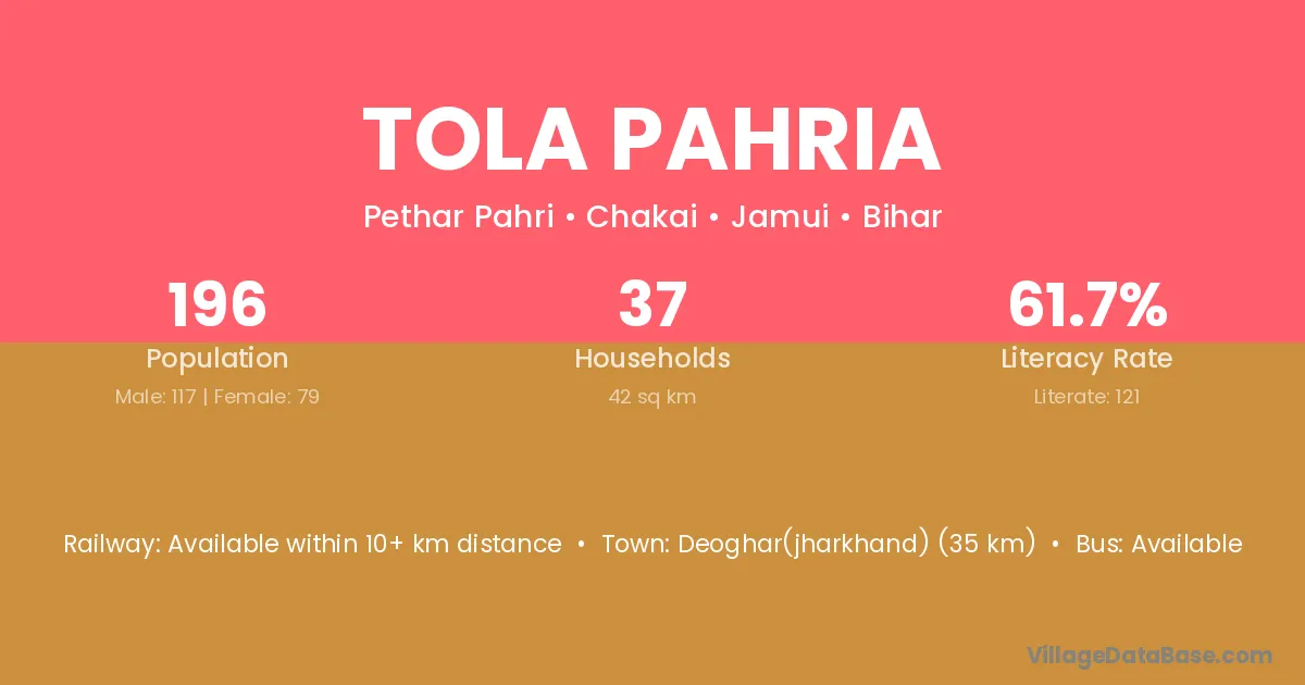 Deoghar(jharkhand) (35 km) is the nearest town to Tola Pahria village for major economic activities and is located approximately 35 km away.