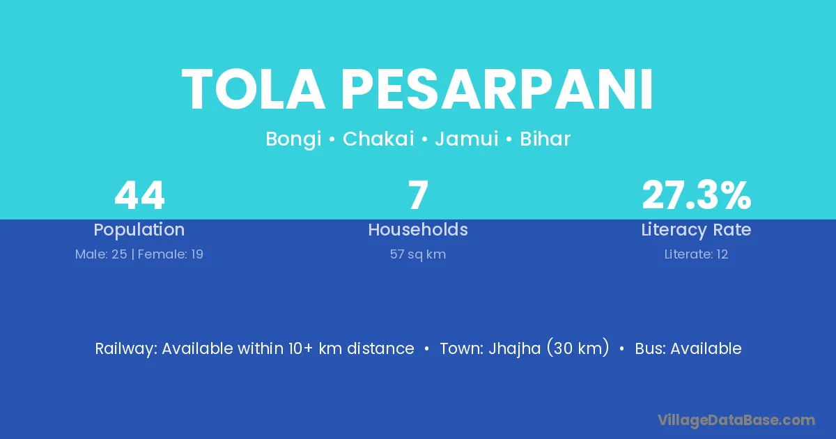 Jhajha (30 km) is the nearest town to Tola Pesarpani village for major economic activities and is located approximately 30 km away.