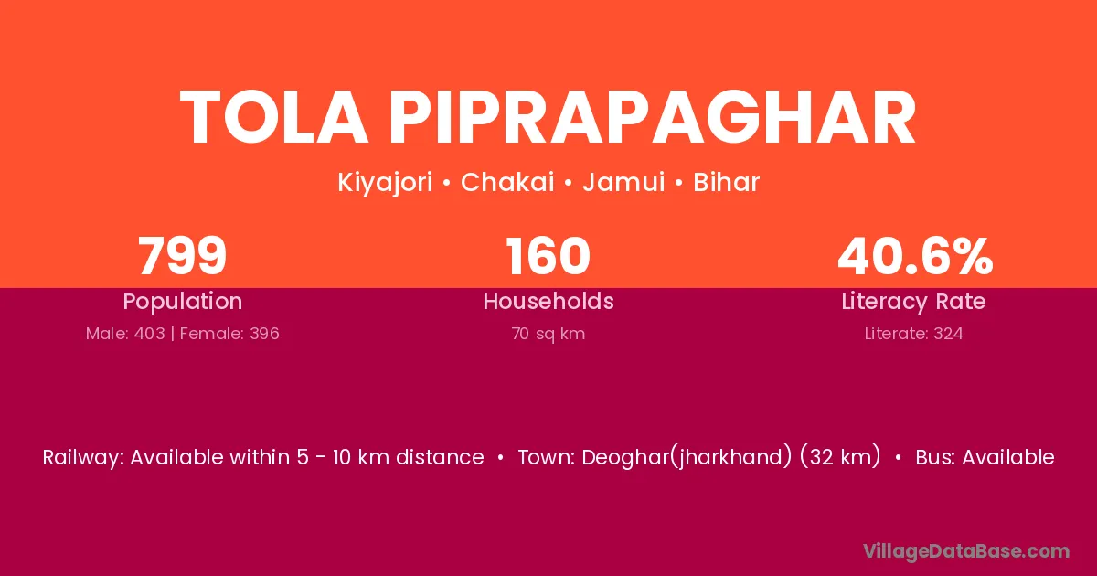 Deoghar(jharkhand) (32 km) is the nearest town to Tola Piprapaghar village for major economic activities and is located approximately 32 km away.