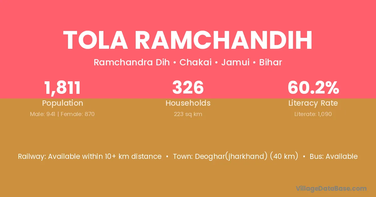 Deoghar(jharkhand) (40 km) is the nearest town to Tola Ramchandih village for major economic activities and is located approximately 40 km away.