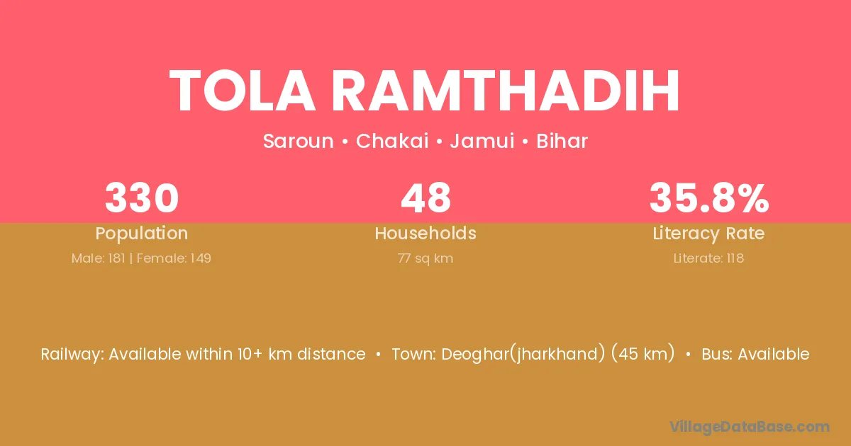 Tola Ramthadih village has a total population of 330 people, of which 181 are males and 149 are females.