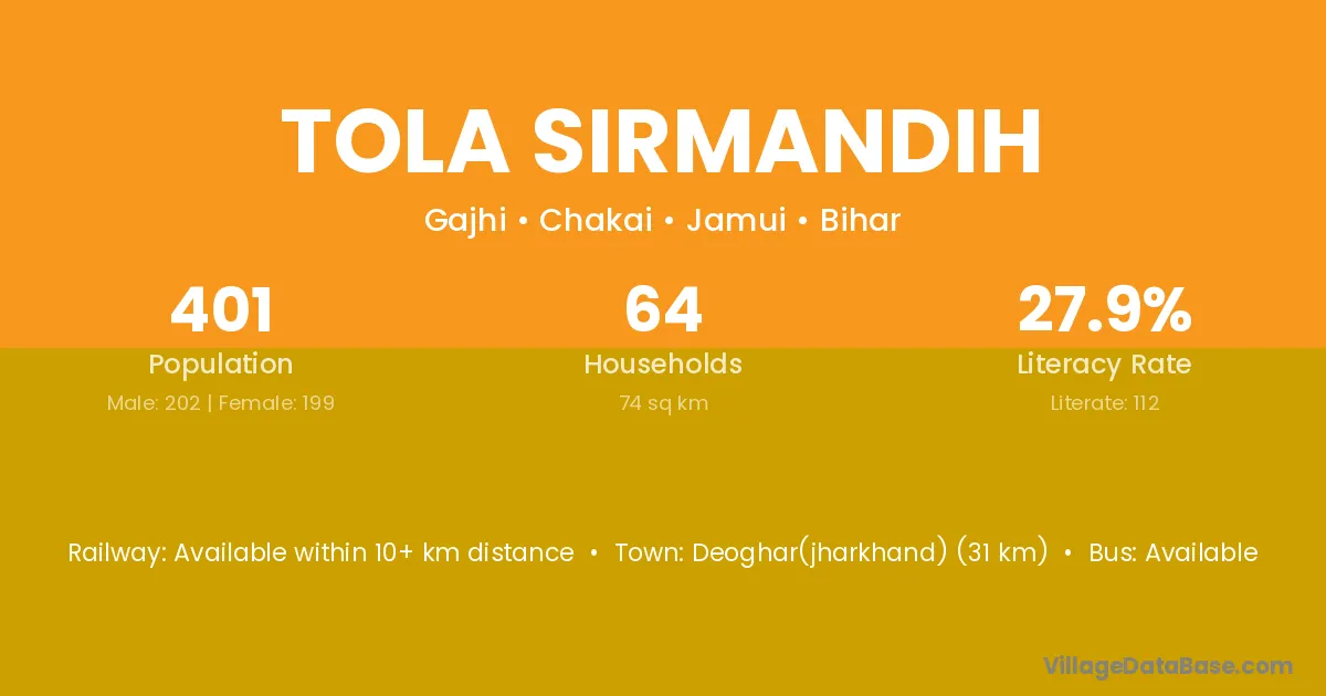 Deoghar(jharkhand) (31 km) is the nearest town to Tola Sirmandih village for major economic activities and is located approximately 31 km away.