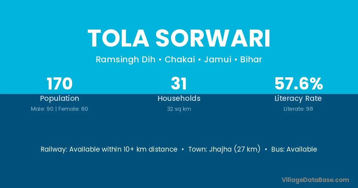 Jhajha (27 km) is the nearest town to Tola Sorwari village for major economic activities and is located approximately 27 km away.