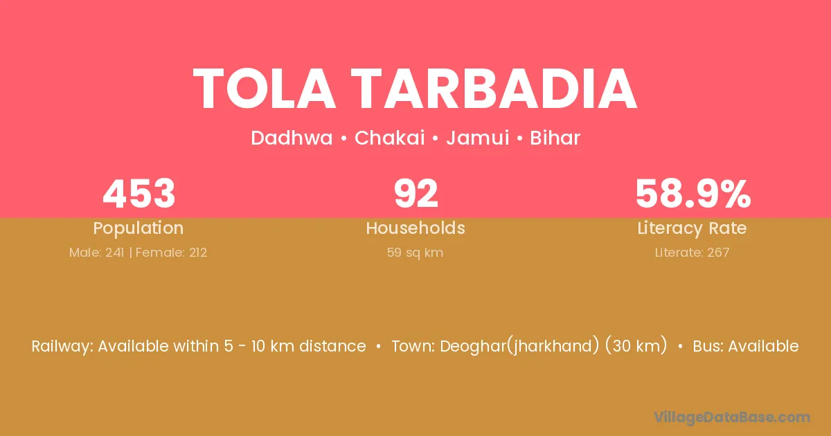 Tola Tarbadia village has a total population of 453 people, of which 241 are males and 212 are females.