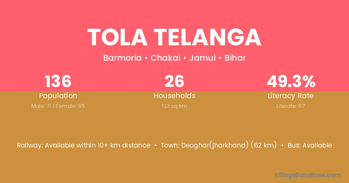 Tola Telanga village has a total population of 136 people, of which 71 are males and 65 are females.