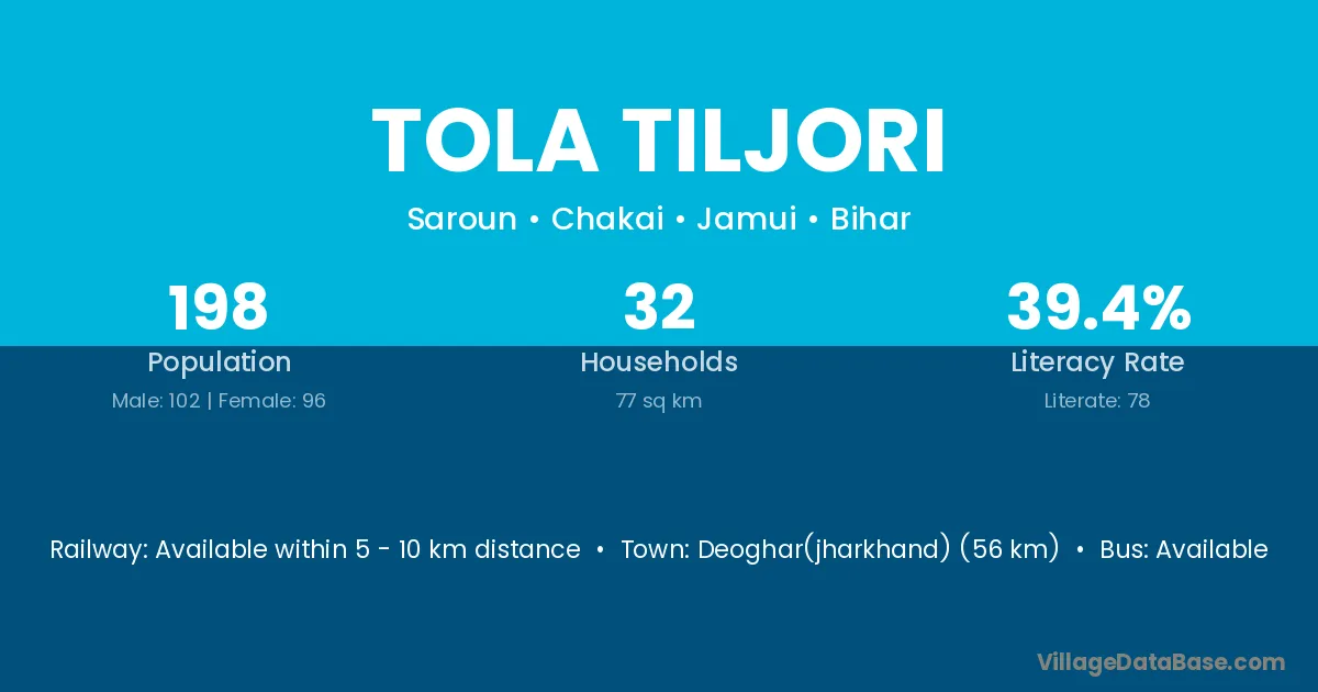 Deoghar(jharkhand) (56 km) is the nearest town to Tola Tiljori village for major economic activities and is located approximately 56 km away.