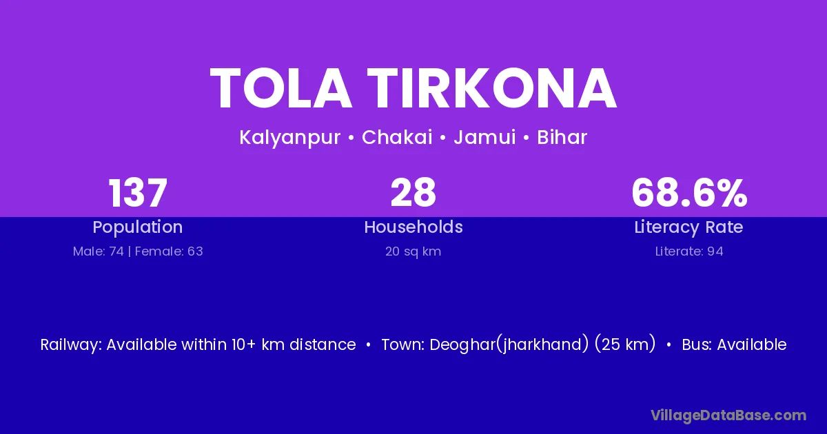 Deoghar(jharkhand) (25 km) is the nearest town to Tola Tirkona village for major economic activities and is located approximately 25 km away.