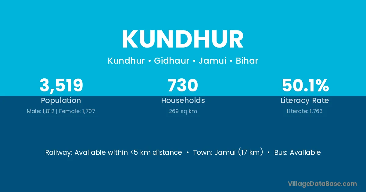 Jamui (17 km) is the nearest town to Kundhur village for major economic activities and is located approximately 17 km away.