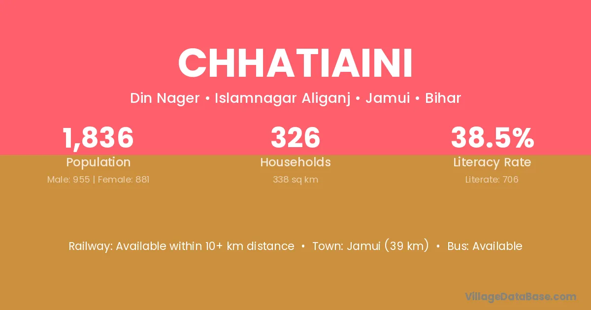 Jamui (39 km) is the nearest town to Chhatiaini village for major economic activities and is located approximately 39 km away.