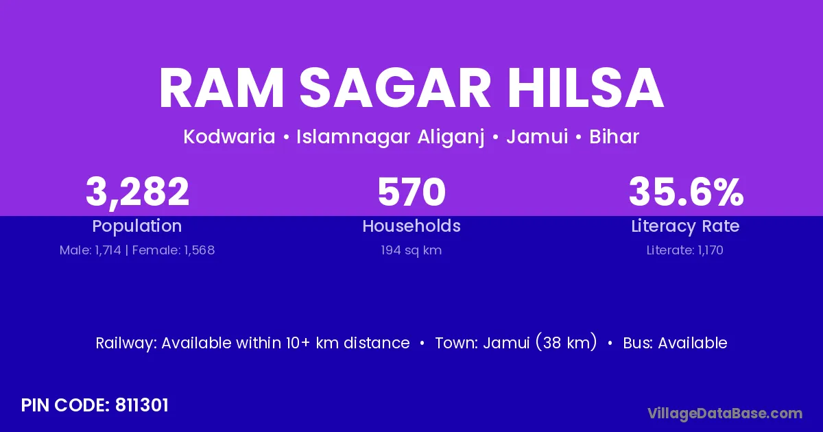 Jamui (38 km) is the nearest town to Ram Sagar Hilsa village for major economic activities and is located approximately 38 km away.