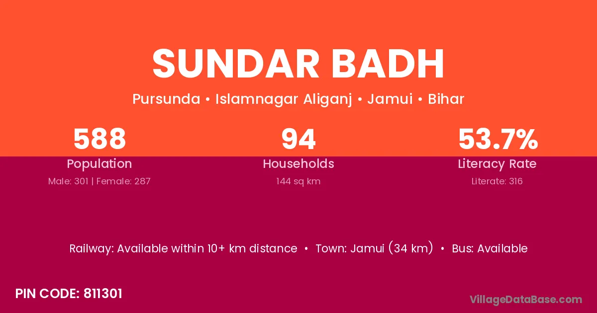 Jamui (34 km) is the nearest town to Sundar Badh village for major economic activities and is located approximately 34 km away.
