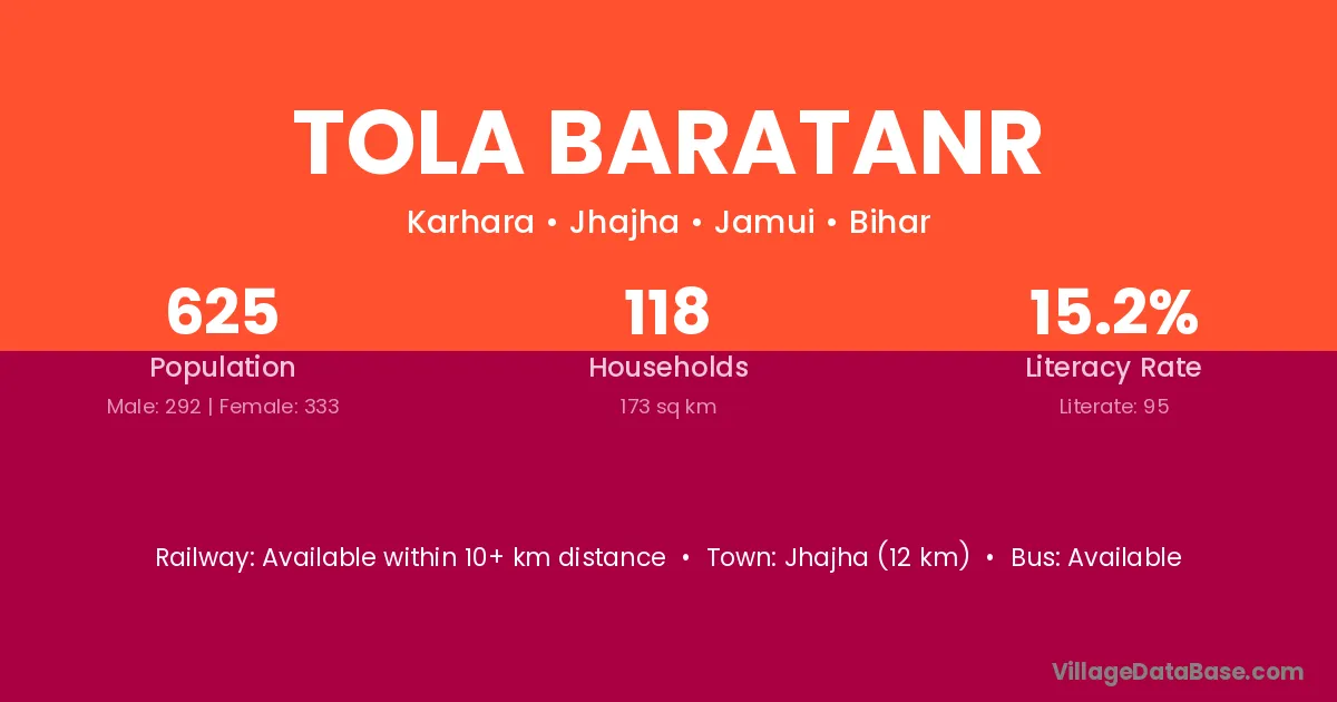 Jhajha (12 km) is the nearest town to Tola Baratanr village for major economic activities and is located approximately 12 km away.