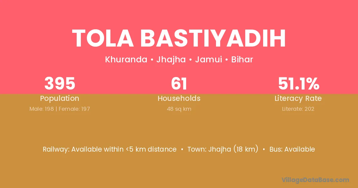 Tola Bastiyadih village has a total population of 395 people, of which 198 are males and 197 are females.
