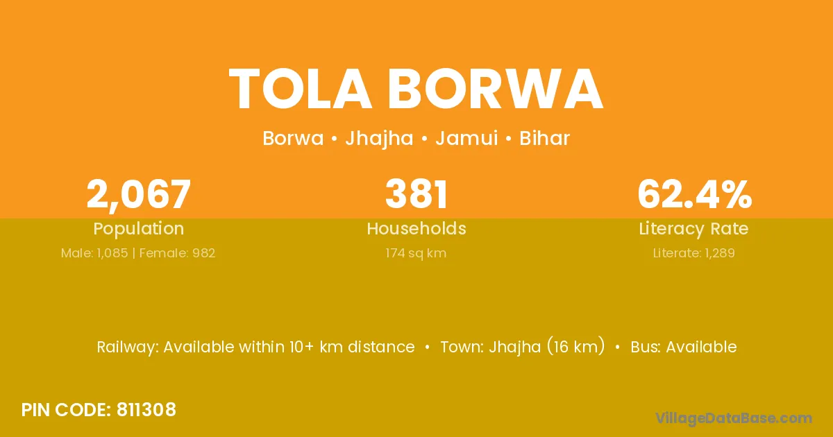 Jhajha (16 km) is the nearest town to Tola Borwa village for major economic activities and is located approximately 16 km away.