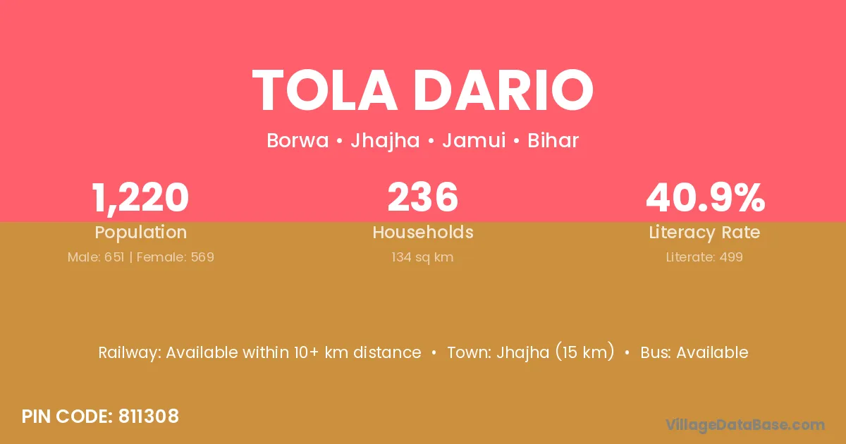 Jhajha (15 km) is the nearest town to Tola Dario village for major economic activities and is located approximately 15 km away.
