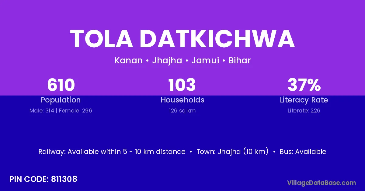 Jhajha (10 km) is the nearest town to Tola Datkichwa village for major economic activities and is located approximately 10 km away.