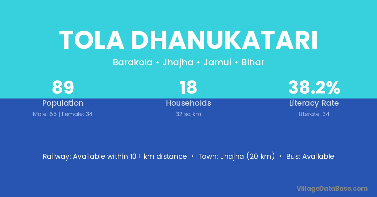 Jhajha (20 km) is the nearest town to Tola Dhanukatari village for major economic activities and is located approximately 20 km away.