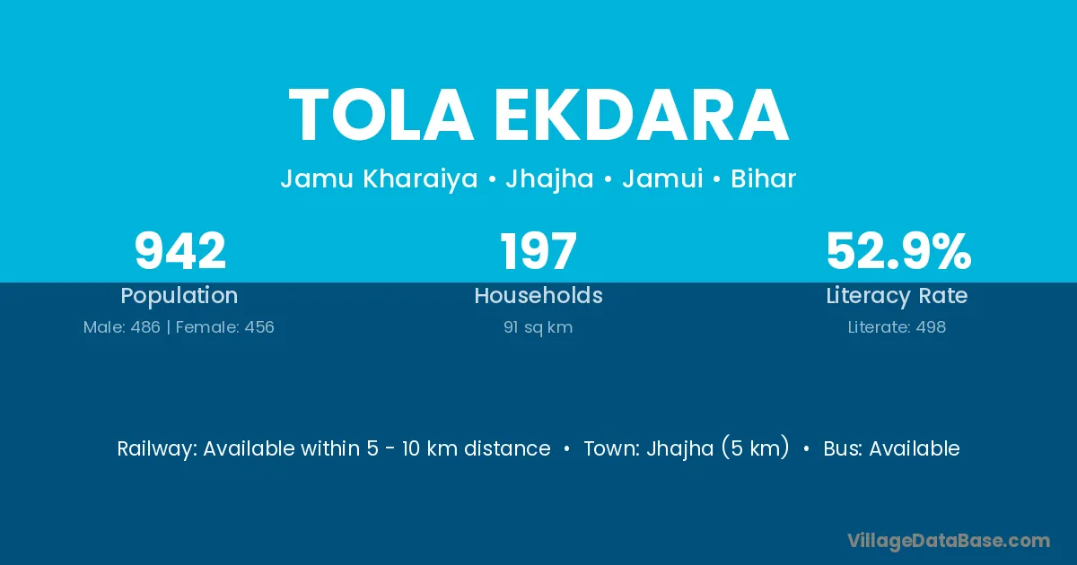 Jhajha (5 km) is the nearest town to Tola Ekdara village for major economic activities and is located approximately 5 km away.